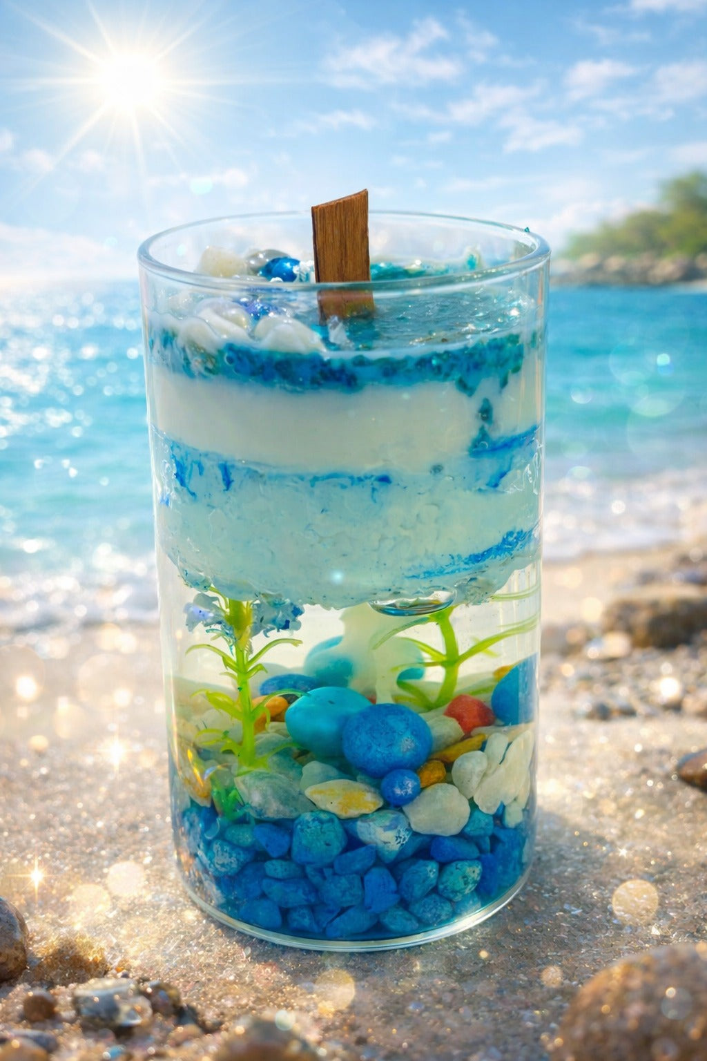 🌊 Ocean-Inspired Design – Layered gel wax with stones and aquatic elements